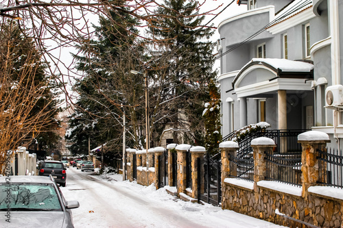 Obraz premium Street of town covered with snow. Belgrade is a largest town and capital of Serbia. Dedinje is a rich part of town.