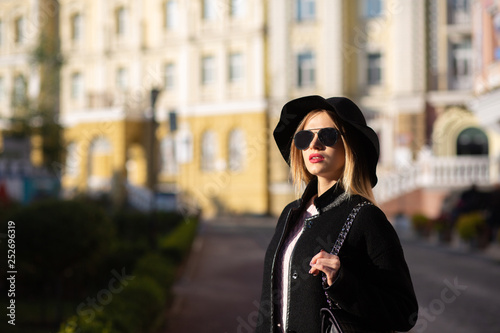 © vpavlyuk, Fototapeta premium Street portrait of stunning blonde lady posing at the street with sun light. Empty space