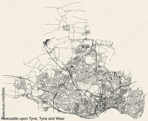 Naklejka premium Street roads map of the METROPOLITAN BOROUGH AND CITY OF NEWCASTLE UPON TYNE,...