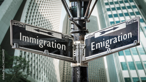 © Thomas Reimer, Obraz premium Street Sign Emigration versus Immigration