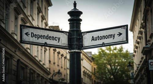 © DhanaStudio, Obraz premium Street sign pointing towards Dependency and Autonomy in a cityscape.