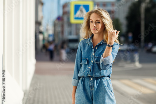 Fototapeta premium Street style. Beautiful woman walks on the street at the Moscow City at sunny...