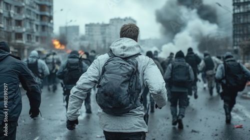 Fototapeta premium Street unrest: intense city riots featuring violent protest march, with explosions, smoke filling the air, showcasing conflict between angry demonstrators, police amidst chaos of urban disaster