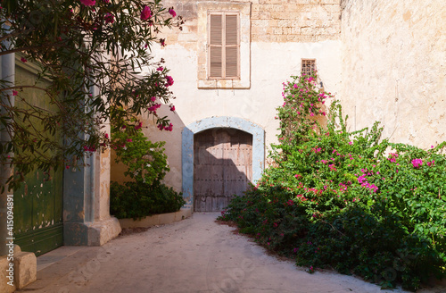 Fototapeta premium Street view with old wooden door and flowers. Malta, Rabat