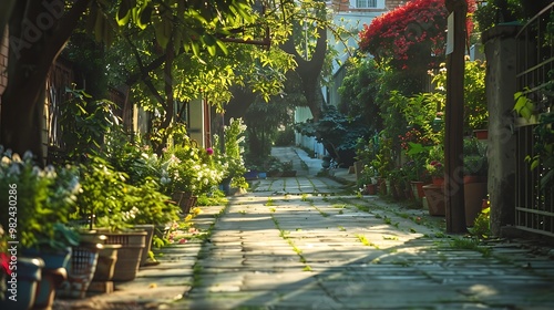 © QAISAR, Obraz premium Street walk with nice brightness and garden surroundings