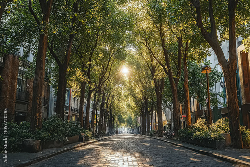 Naklejka premium Street with a row of trees and cars parked on the side. The street is empty and the trees are green