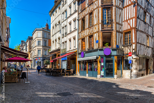 Fototapeta premium Street with timber framing houses in Rouen, Normandy, France. Architecture and landmarks of Rouen. Cozy cityscape of Rouen