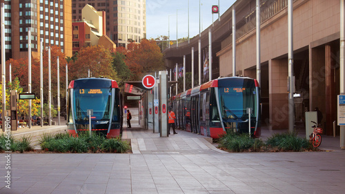 Fototapeta premium Streetscape outside Circular quay light rail station. Pictured are two light rail trains.