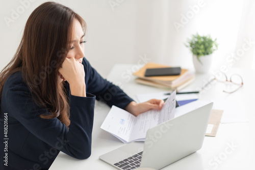 © eggeeggjiew, Fototapeta premium Stressed Asian Businesswoman calculating her Debt at home.
