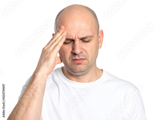 Obraz premium Stressed Bald Man Touching Forehead with Eyes Closed, Frontal View, Isolated...