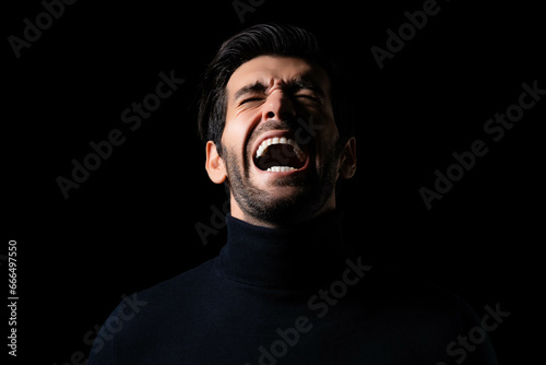 © Nutlegal, Fototapeta premium Stressed Young angry man screaming and shouting Frustrated handsome man agonizing and torturing expression He get maddening and overwhelming rage in the dark room black background Agressive man