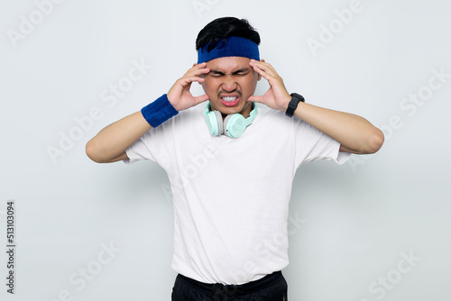 © Bangun Stock Photo, Fototapeta premium Stressed young Asian sportman in blue headband and sportswear white t-shirt with headphones, touching his temples and having headache isolated on white background. Workout sport concept