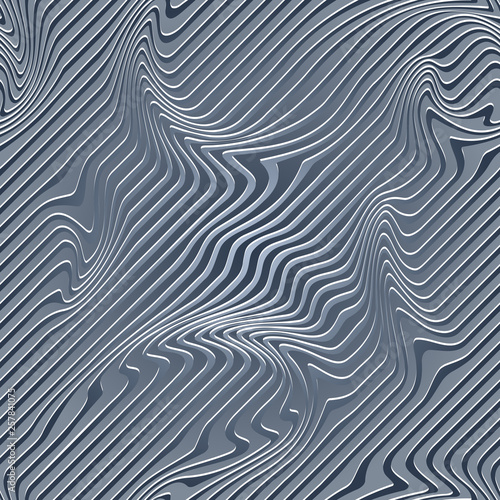 © Dvarg, Obraz premium Streszczenie ilustracja Wave Stripes. Niebiesko-szare tło w paski z geometrycznym wzorem i wizualnym efektem zniekształcenia. Złudzenie optyczne i zakrzywione linie. Sztuka op.