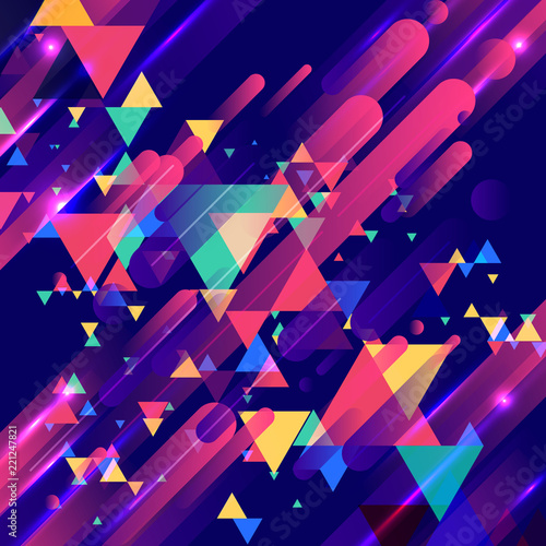 © phochi, Obraz premium Streszczenie kolorowe elementy i kreatywne nowoczesne nakładających się trójkąty geometryczne zaokrąglone linie wzór ruchu z technologii blask oświetlenia kolorowy na ciemnym niebieskim tle