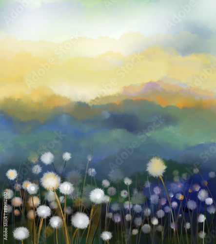 © nongkran_ch, Fototapeta premium Streszczenie obraz olejny białe kwiaty pola w miękkim kolorze. Obrazy olejne biały kwiat mniszka lekarskiego na łąkach. Wiosną kwiatów sezonowych charakter z niebieskim - zielone wzgórze w tle.