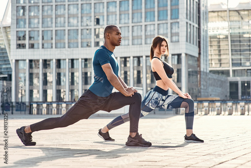 Fototapeta premium Stretching after great workout. Side view of sporty and healthy couple stretching legs during morning workout against modern buildings.