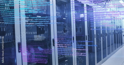 Fototapeta premium Stretching glass-door server racks showing blinking LEDs and code overlay in...