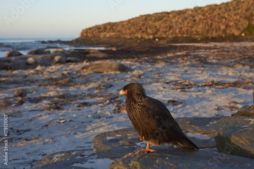 Naklejka premium Striated Caracara (Phalcoboenus australis) on the coast of Sea Lion Island in...