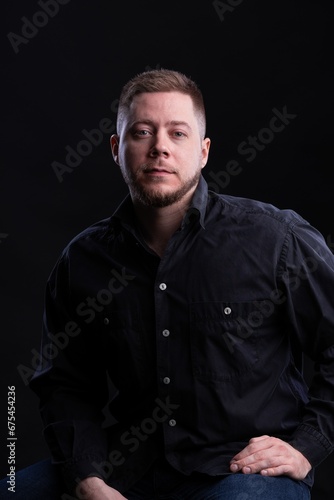 Obraz premium Strict and stylish Man in black shirt on dark background.