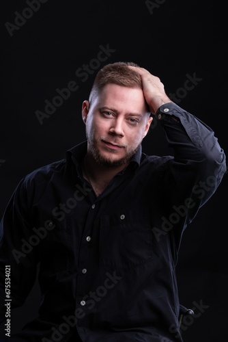 Obraz premium Strict and stylish Man in black shirt on dark background.