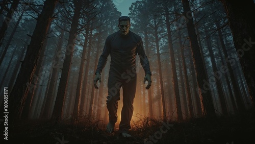 Fototapeta premium Striding bulky monster wearing dark shirt through pine forest at dusk, with...