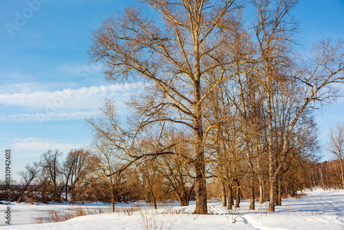 Fototapeta premium Striking bare trees line a snowy riverbank under a vast, bright blue winter sky with delicate clouds, golden sunlight highlights trunks