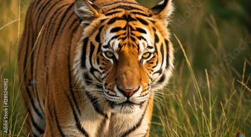 Fototapeta premium Striking Bengal Tiger Portrait in Natural Habitat Staring Directly Forward
