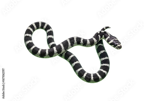 © isolatedpng, Naklejka premium Striking black and white patterned snake gracefully coiled on a pristine white background, showcasing its unique beauty and intricate scale patterns in sharp detail.