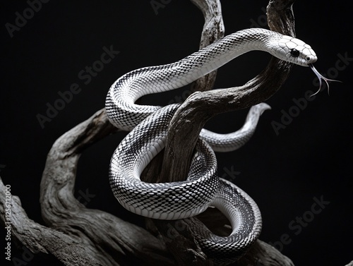 © BerkahStock, Fototapeta premium Striking black and white snake coiled on a weathered branch against a dark background.