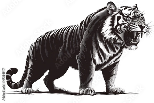 © Snigdha, Fototapeta premium Striking black and white vector illustration of a powerful roaring tiger standing proudly