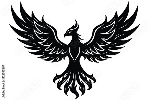 Fototapeta premium Striking Black Silhouette of a Phoenix with Wings Spread Wide on a White...