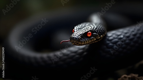 © abdulhalim, Fototapeta premium Striking Black Snake with Red Eyes in Natural Habitat Venomous Reptile Portrait