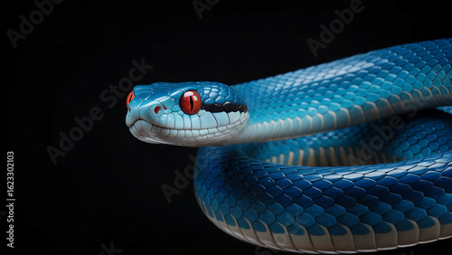 © eyasin, Obraz premium Striking Blue Pit Viper with Intense Red Eyes on Black Background Captivating Reptilian Portrait Close Up View Exotic Snake
