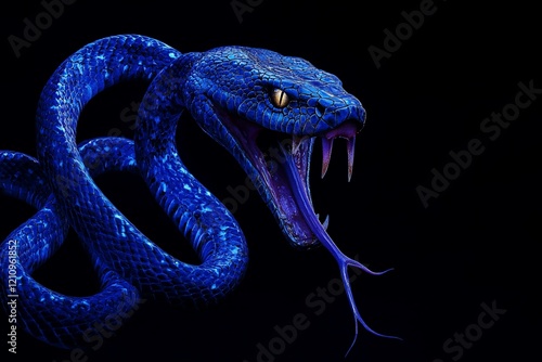 © BerkahStock, Fototapeta premium Striking blue viper with fangs, coiled, black background.