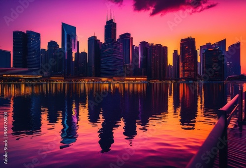 Obraz premium striking bold skyline silhouettes set vibrant sunset rich hues purple...