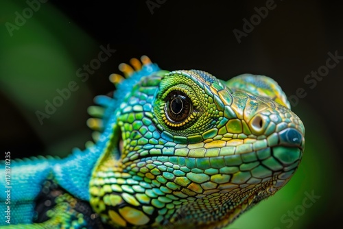 © juliars, Fototapeta premium Striking close up of a vibrant lizard, highlighting its intricate scale patterns and captivating colors
