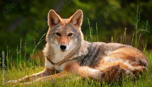 Naklejka premium Striking Closeup of a Resting Coyote Canis latrans Amidst Lush Grassland at Sunrise, Capturing Serene Moments in the Wild