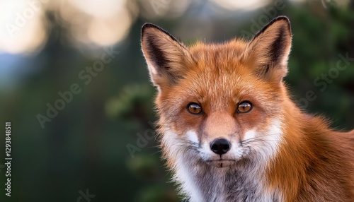 © netsay, Fototapeta premium Striking Closeup Portrait of a Red Fox Vulpes vulpes amidst Bokeh of Pine Trees at Sunset, Capturing the Enchantment of Forest and Wilderness in Velvet Mood