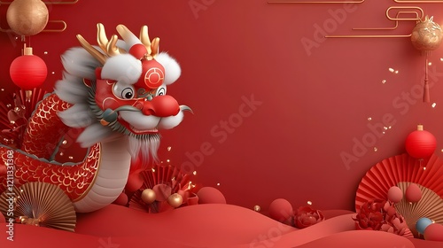 Fototapeta premium Striking 3D Chinese Dragon Head Adorned with Vibrant Patterns Fluffy Details and Glowing Light Trails Set Against a Bold Festive Backdrop