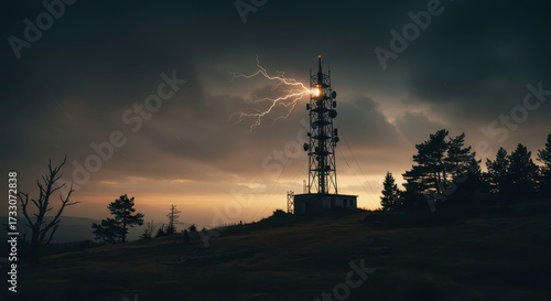 Obraz premium Striking depiction captures the raw power of a thunderstorm, with lightning illuminating a communications tower against a dramatic, moody, and ominous sky during the dusk of the evening.