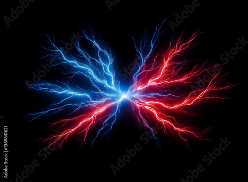 © YiuCheung, Fototapeta premium Striking display of energy with vibrant blue and red lightning bolts emanating from a central point on a stark black backdrop, creating a powerful visual of opposing forces colliding.