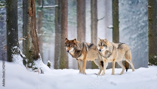 © netsay, Naklejka premium Striking Duo of Wolves Frolic in a SnowCovered Forest on a Winters Day Majestic Beauty and Boundless Energy Captured in the Magical Landscape