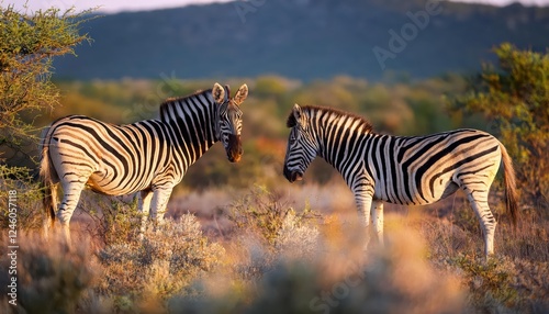 © netsay, Fototapeta premium Striking Encounter with Two Plains Zebras Equus burchelli in their Natural Habitat at Sunset, South Africa