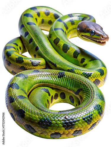 Obraz premium Striking green anaconda serpent coiled displaying vibrant scales and patterns isolated for detail study