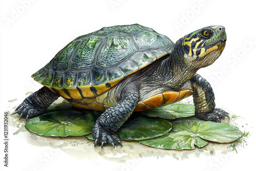 Fototapeta premium Striking illustration of a turtle resting on lily pads.