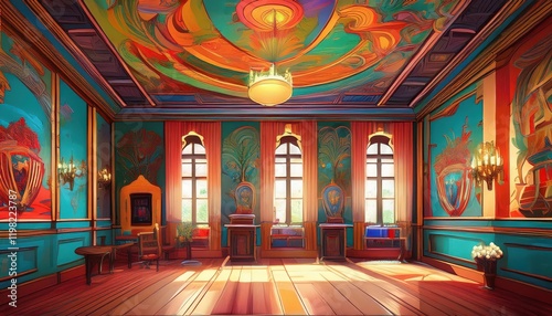 Obraz premium Striking Interior Showcasing an Intricately Painted Vaulted Ceiling, Filled...