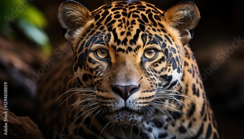 Obraz premium Striking Jaguar Up Close at Sunset in a Serene Savannah, Capturing the...