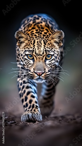 Fototapeta premium Striking leopard walks forward, intense eyes focused, beautiful pattern, and...