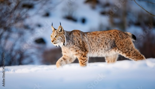 Fototapeta premium Striking Lynx Stepping through Snowy European Wilderness Majestic Felid...