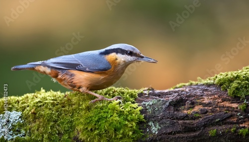 © netsay, Fototapeta premium Striking Nuthatch Sitta Europaea Perched on Mossy Log in Forested Landscape, Capturing the Essence of Wildlife and Nature at Twilight